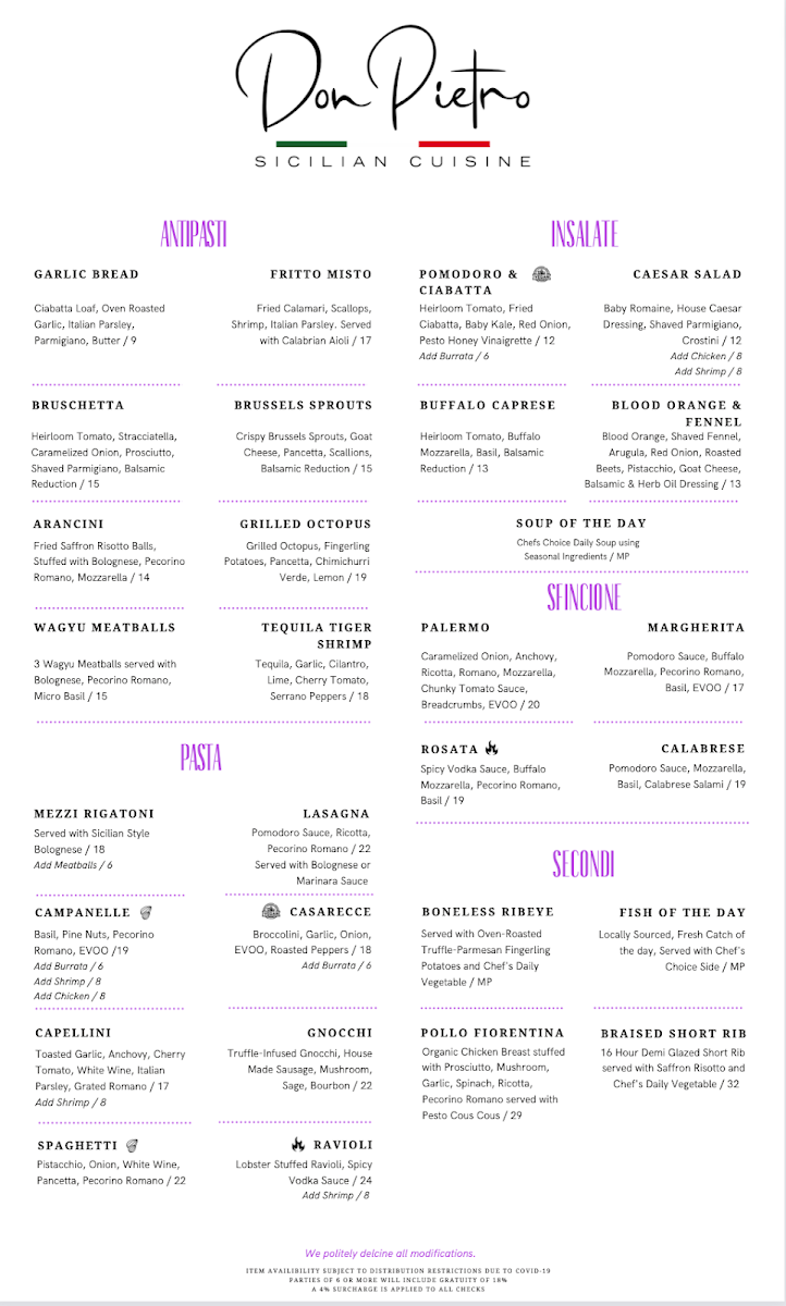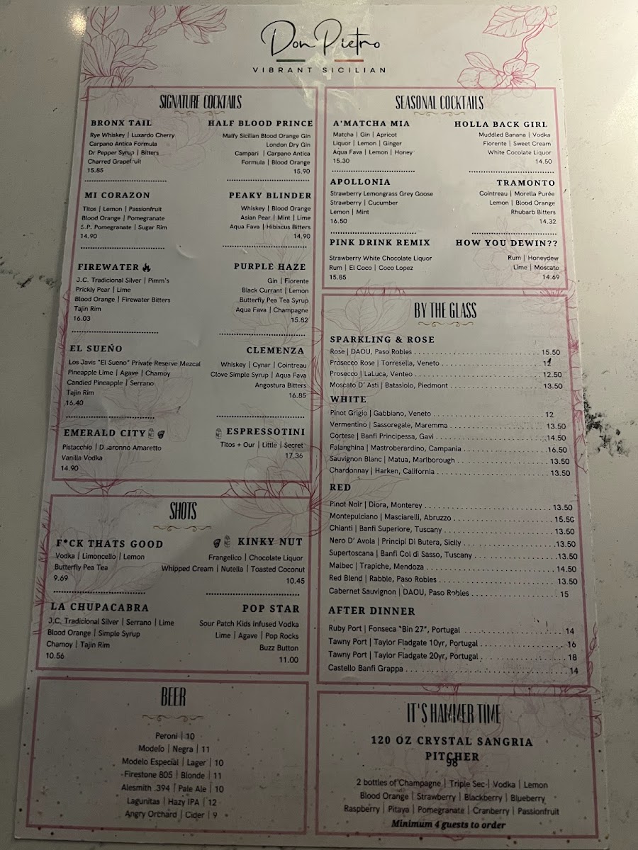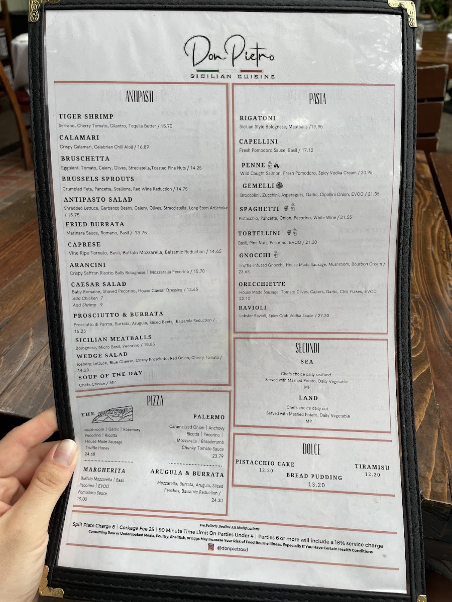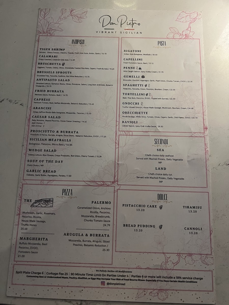 At Trattoria Don Pietro - Sicilian/Italian Cuisine Menu, you’ll find a delightful mix of traditional Sicilian flavors with an Italian twist. Nestled on San Diego Ave in the heart of San Diego, this charming spot brings a piece of Sicily right to your table. From fresh, hand-tossed pizzas to classic pasta dishes, everything on the menu is prepared with care and the finest ingredients. Whether you're in the mood for a hearty bowl of risotto or a delicate seafood entrée, there's something to satisfy every craving. And of course, each dish is paired perfectly with a selection of wines to complement the rich, bold flavors. So, next time you're looking for an authentic taste of Italy in San Diego, Trattoria Don Pietro is the place to be.