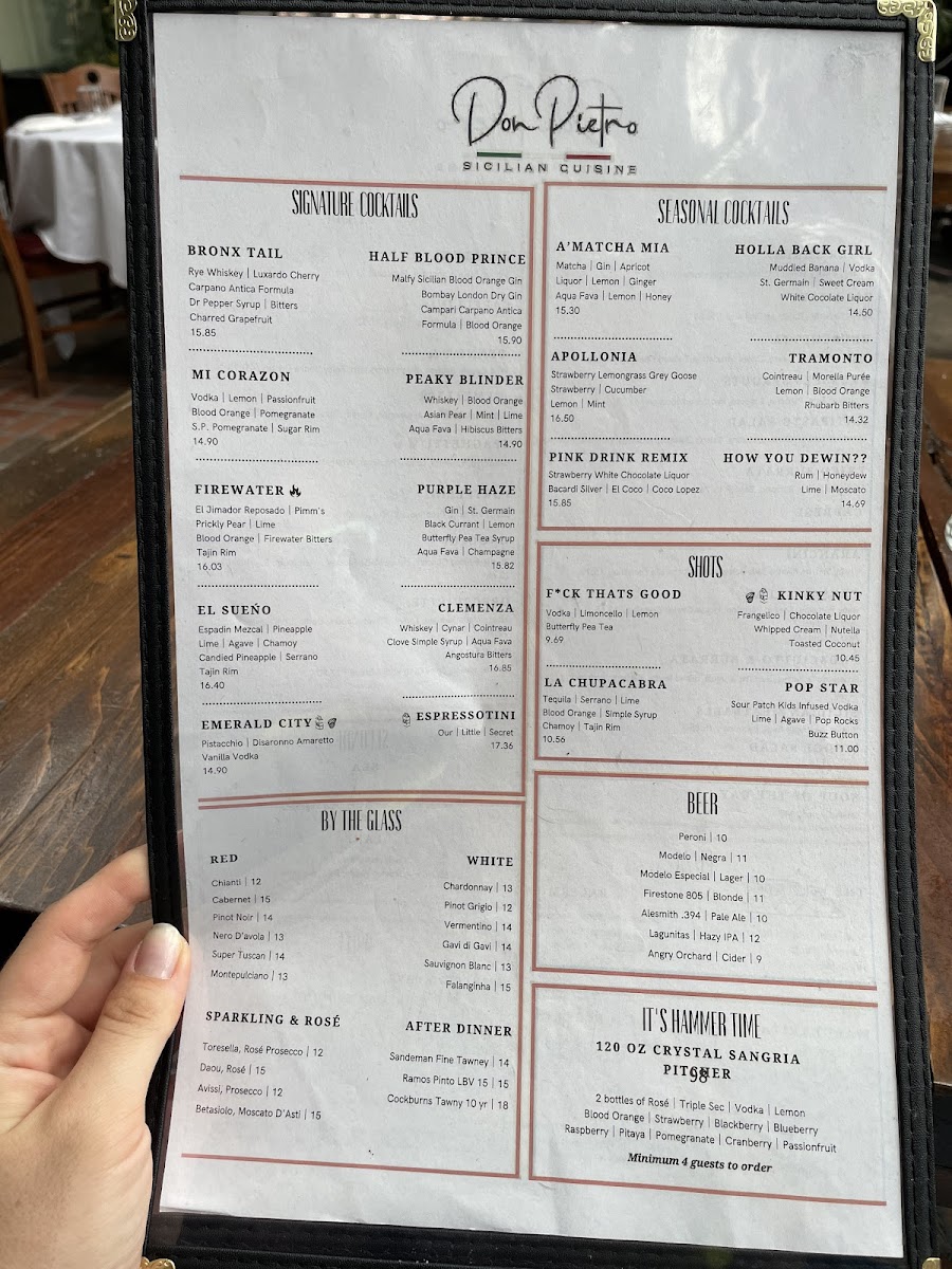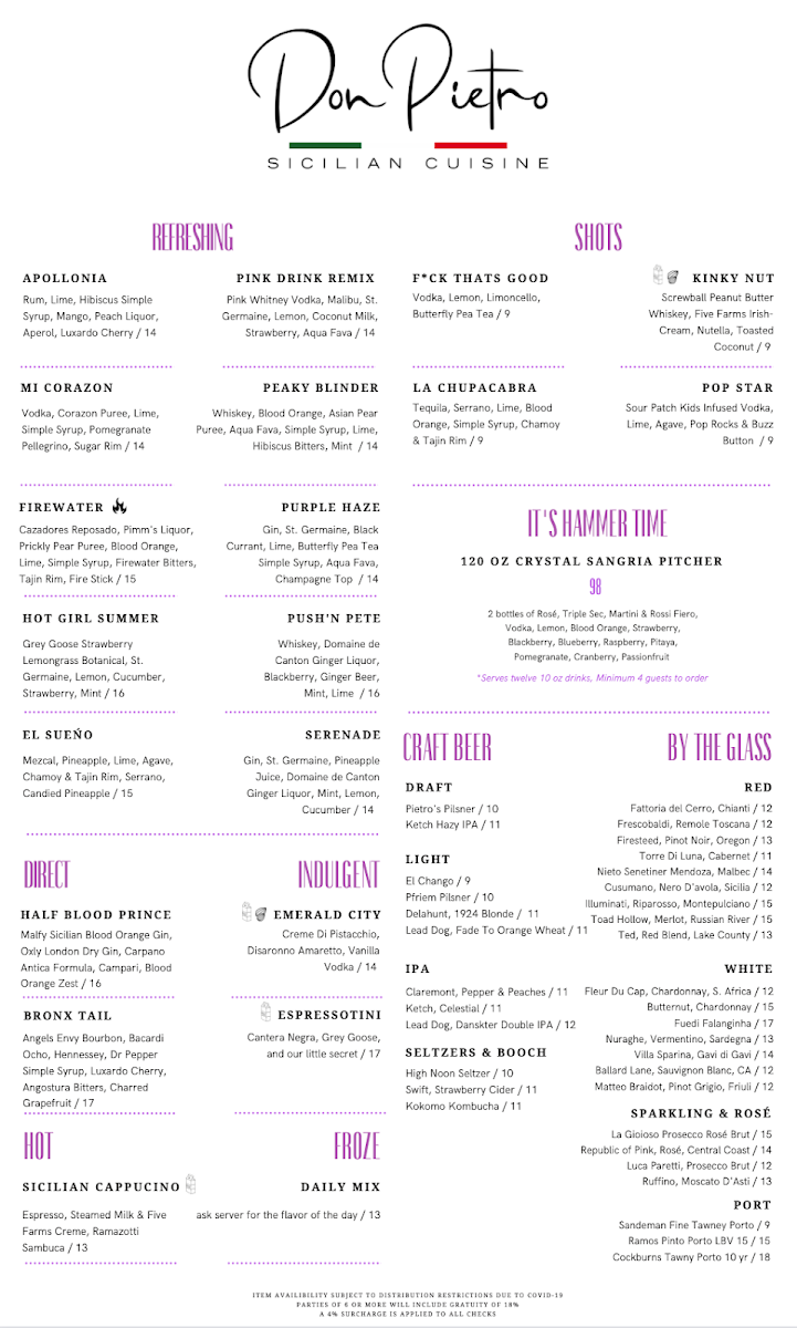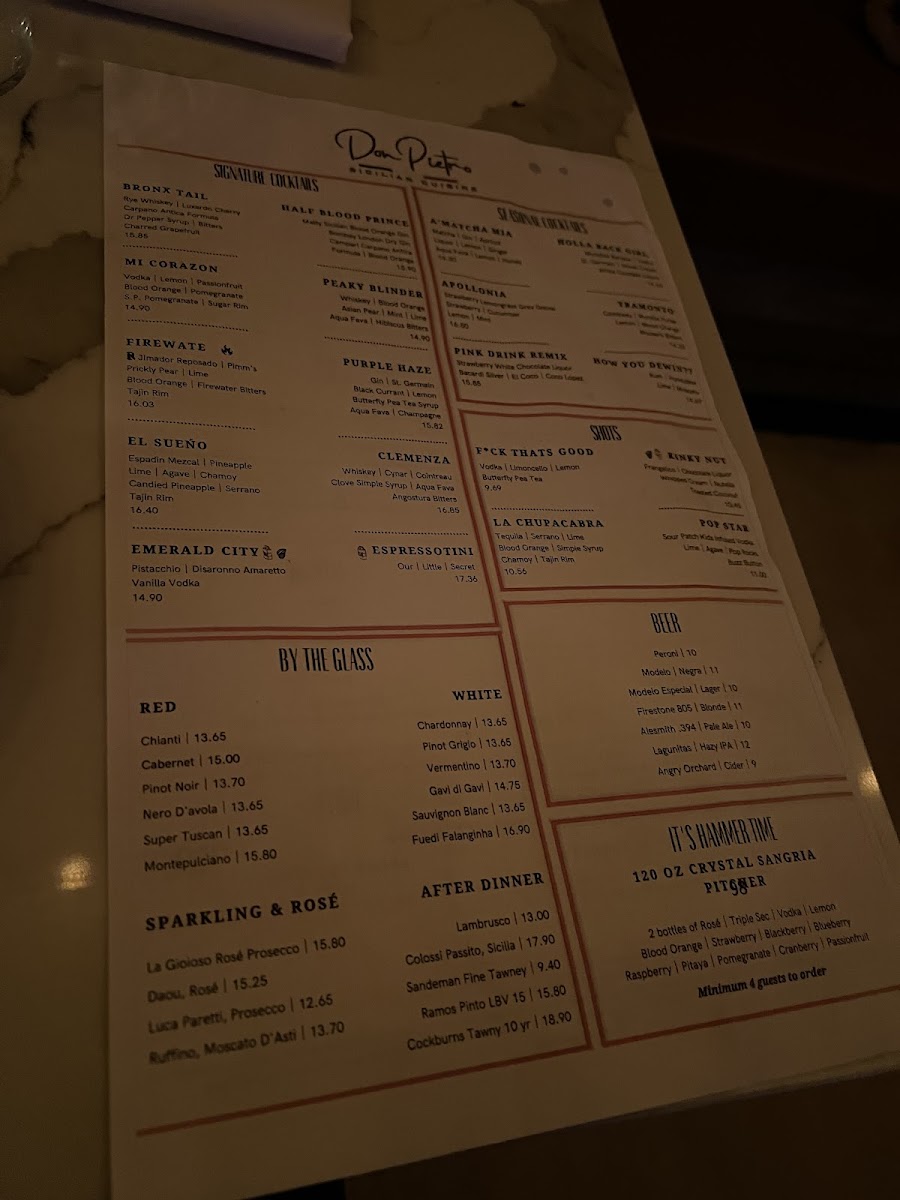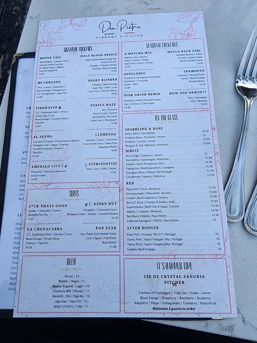 At Trattoria Don Pietro - Sicilian/Italian Cuisine Menu, you’ll find a delightful mix of traditional Sicilian flavors with an Italian twist. Nestled on San Diego Ave in the heart of San Diego, this charming spot brings a piece of Sicily right to your table. From fresh, hand-tossed pizzas to classic pasta dishes, everything on the menu is prepared with care and the finest ingredients. Whether you're in the mood for a hearty bowl of risotto or a delicate seafood entrée, there's something to satisfy every craving. And of course, each dish is paired perfectly with a selection of wines to complement the rich, bold flavors. So, next time you're looking for an authentic taste of Italy in San Diego, Trattoria Don Pietro is the place to be.